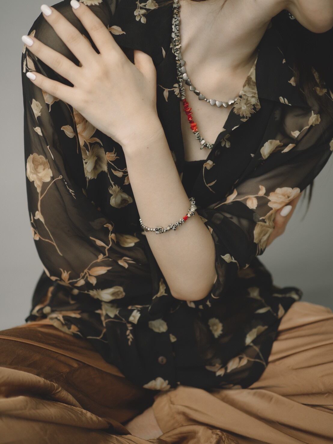 差し色の赤珊瑚が大人なコーディネートを完成させてくれます。