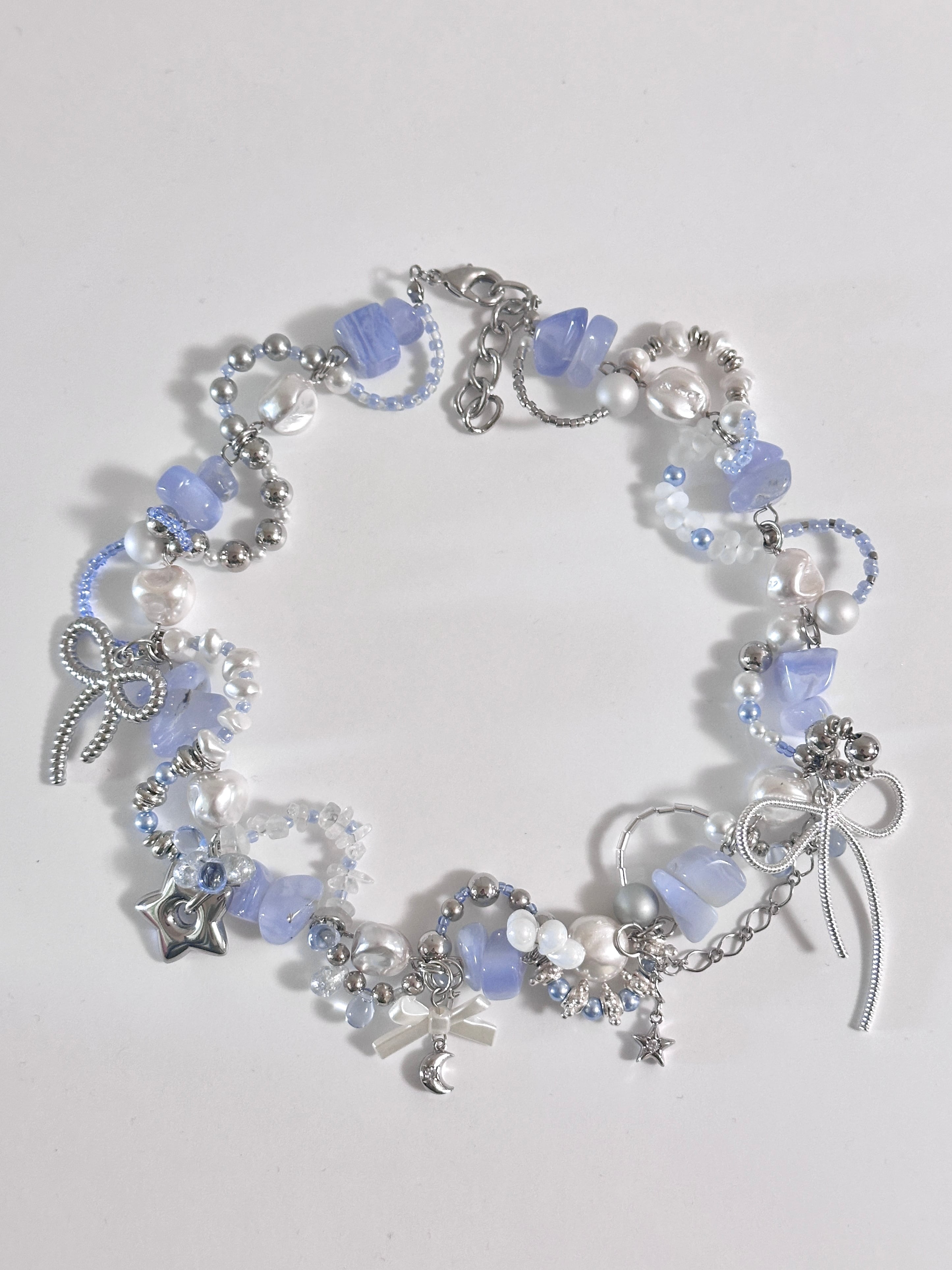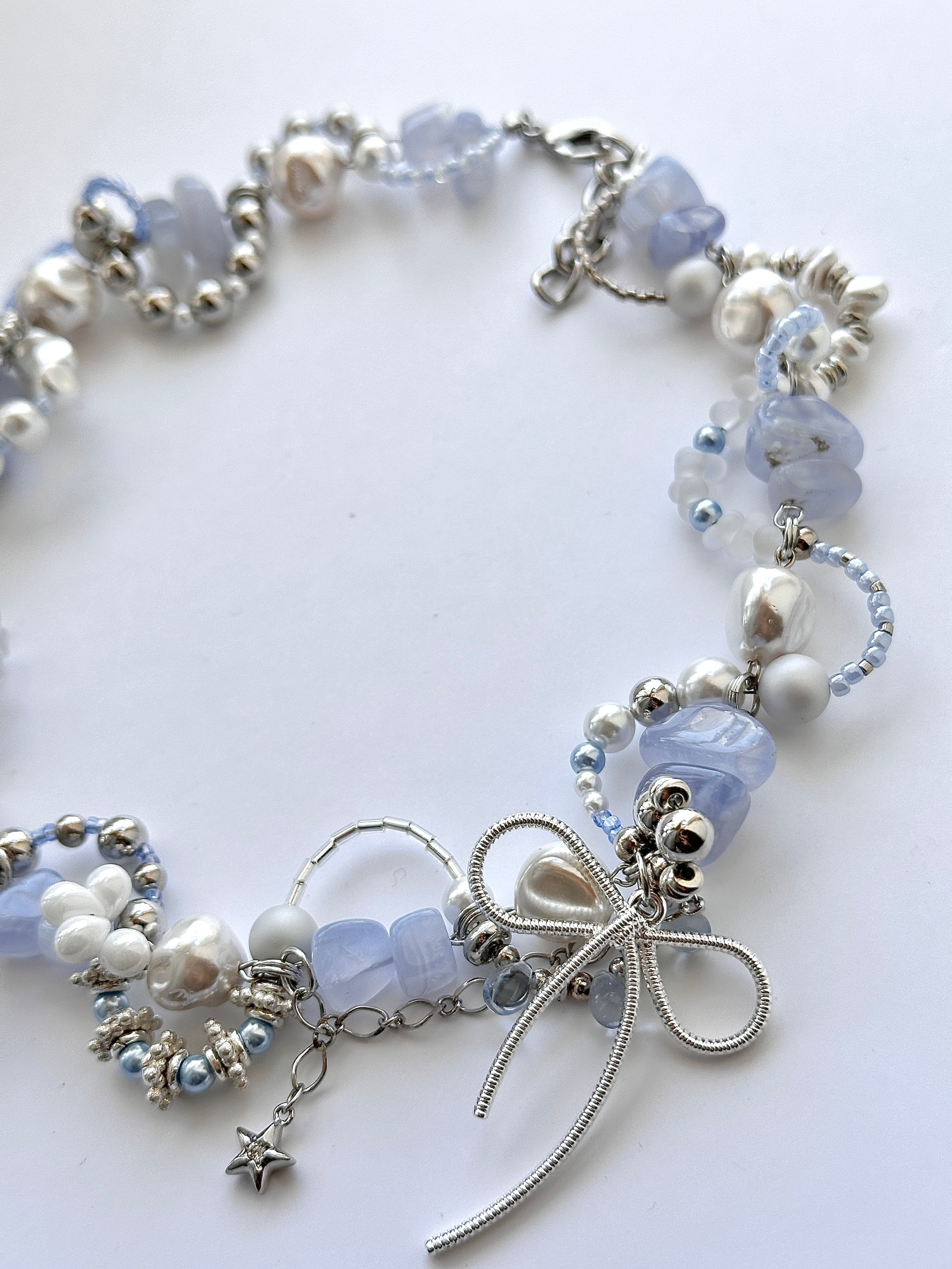 メインに使用したブルーカルセドニーがもたらす石の効果と石言葉は、穏やかでやさしいイメージにあふれています。 「追憶」「ノスタルジア」「精神の安定」「あたたかさ」「優しさ」などなど…。