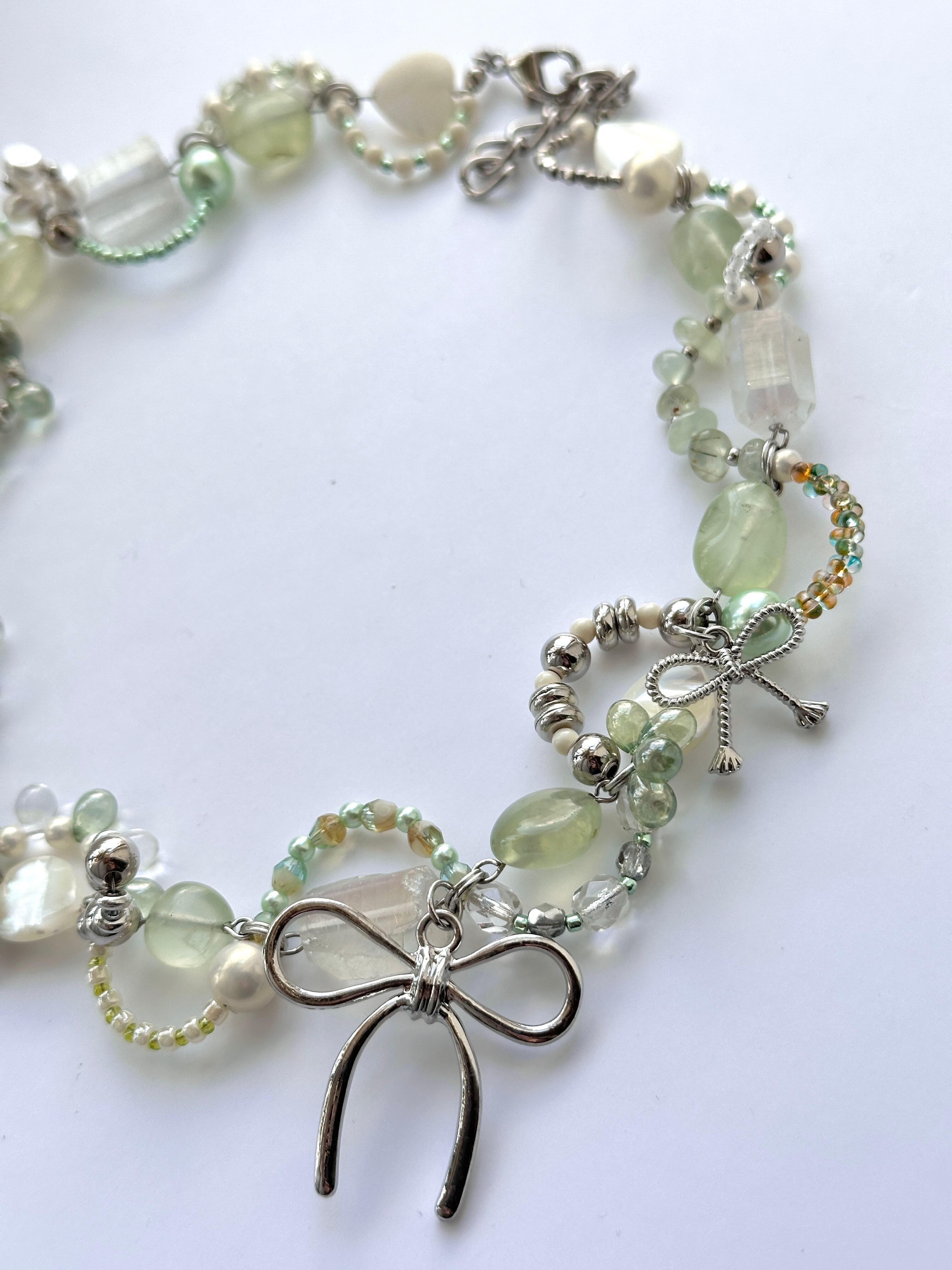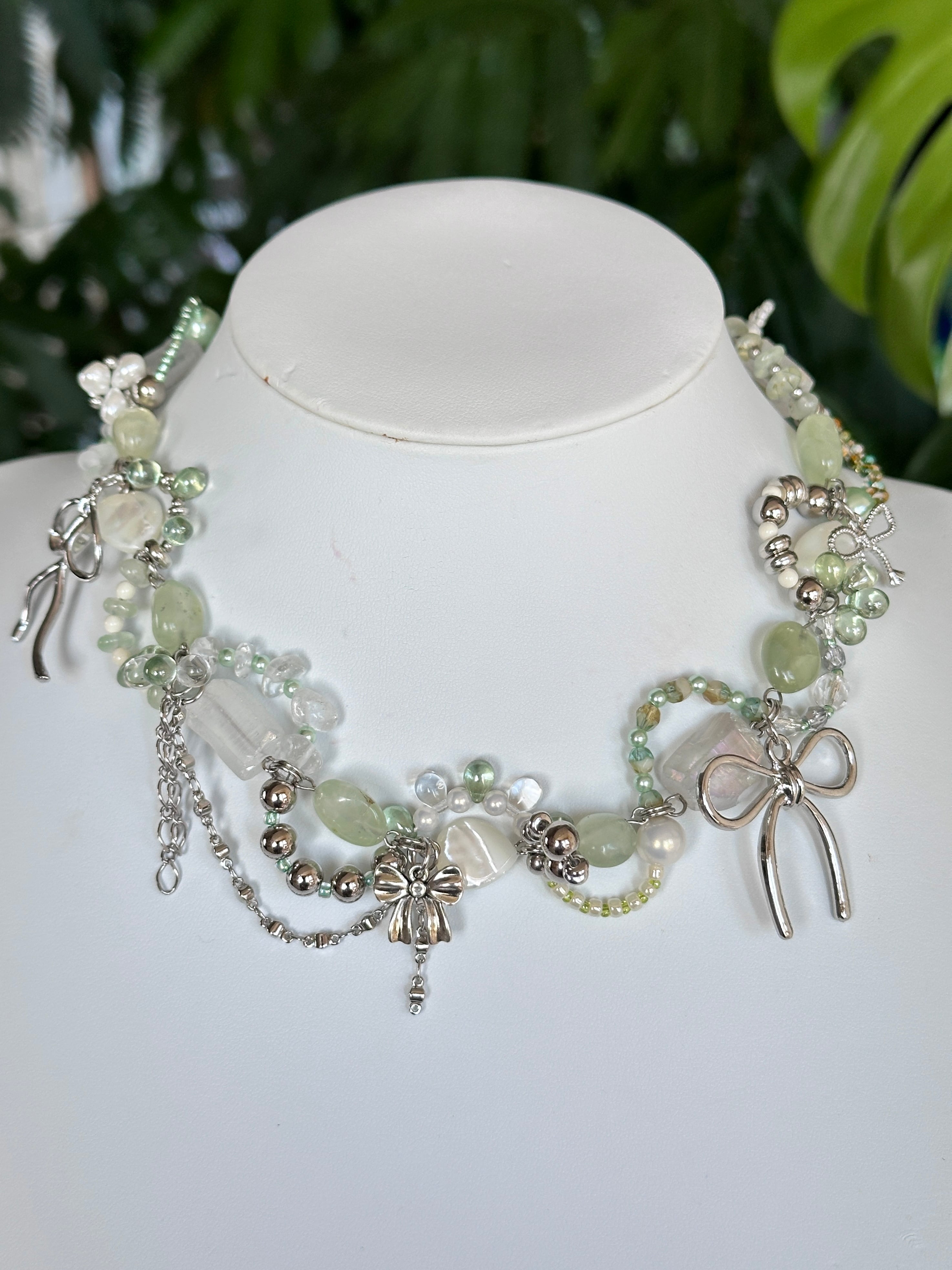 淡いグリーンのプレナイトと透明感溢れる天然石を組み合わせ、陽射しを受けて揺らめく水面を表現しました。