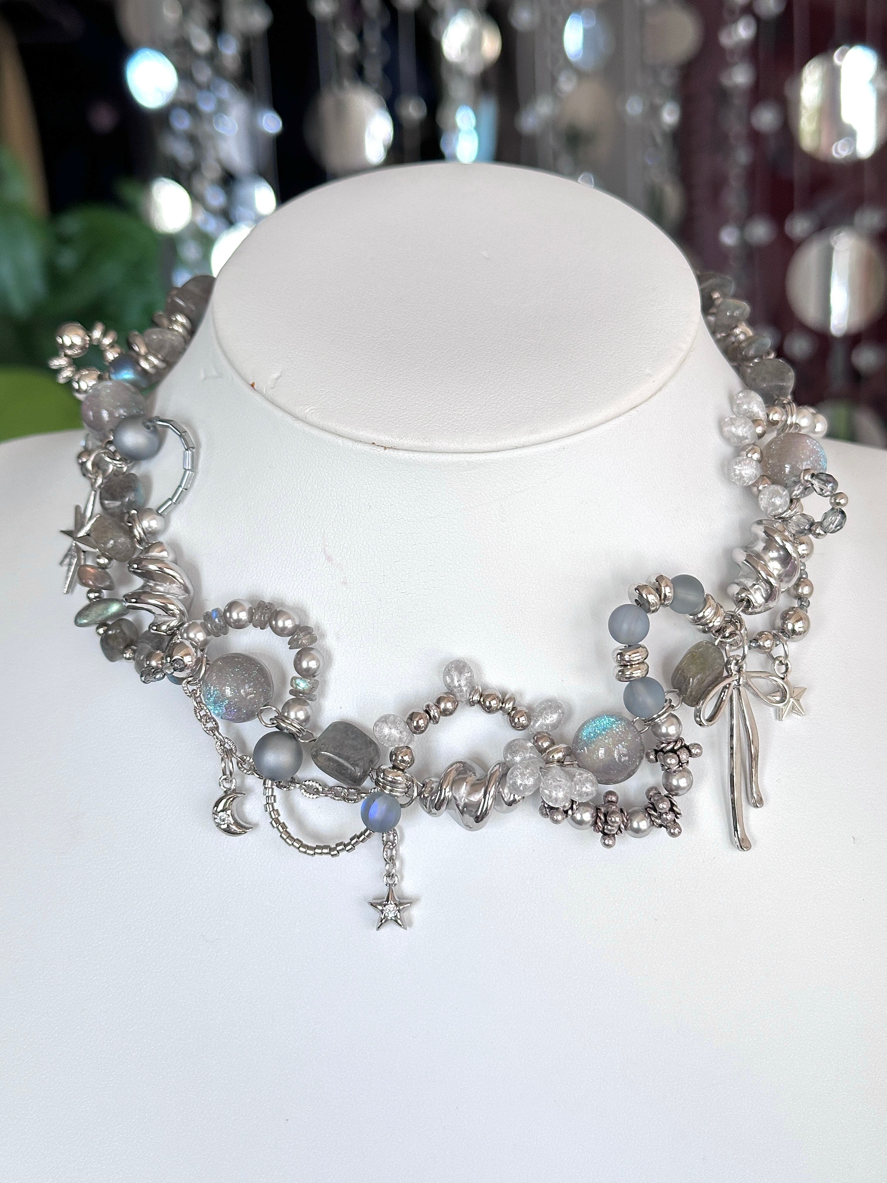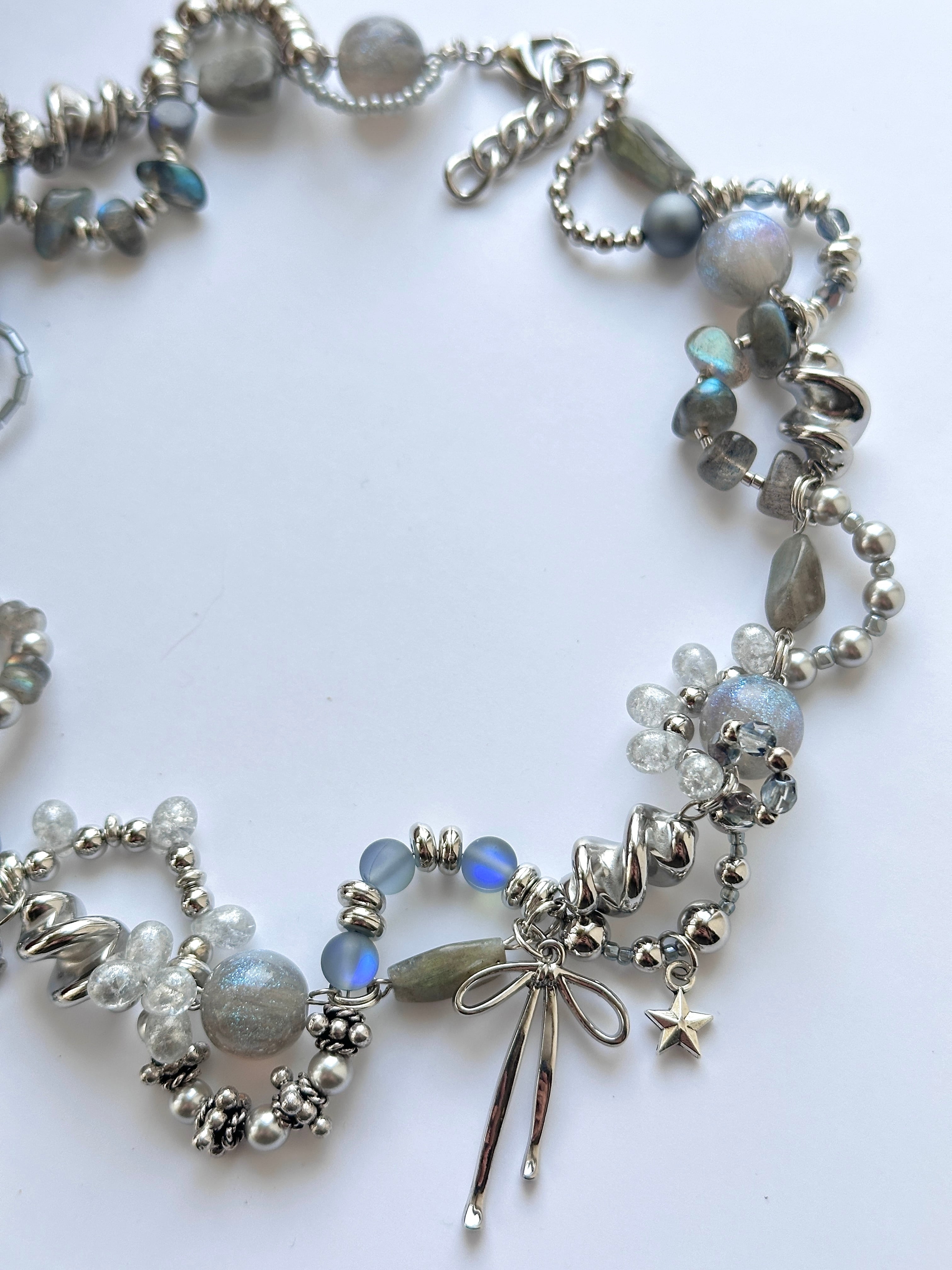 メインで使用したラブラドライトは月、太陽を象徴するといわれ、根気強い実行力を養い、信念を貫けるよう導く力があるとされます。