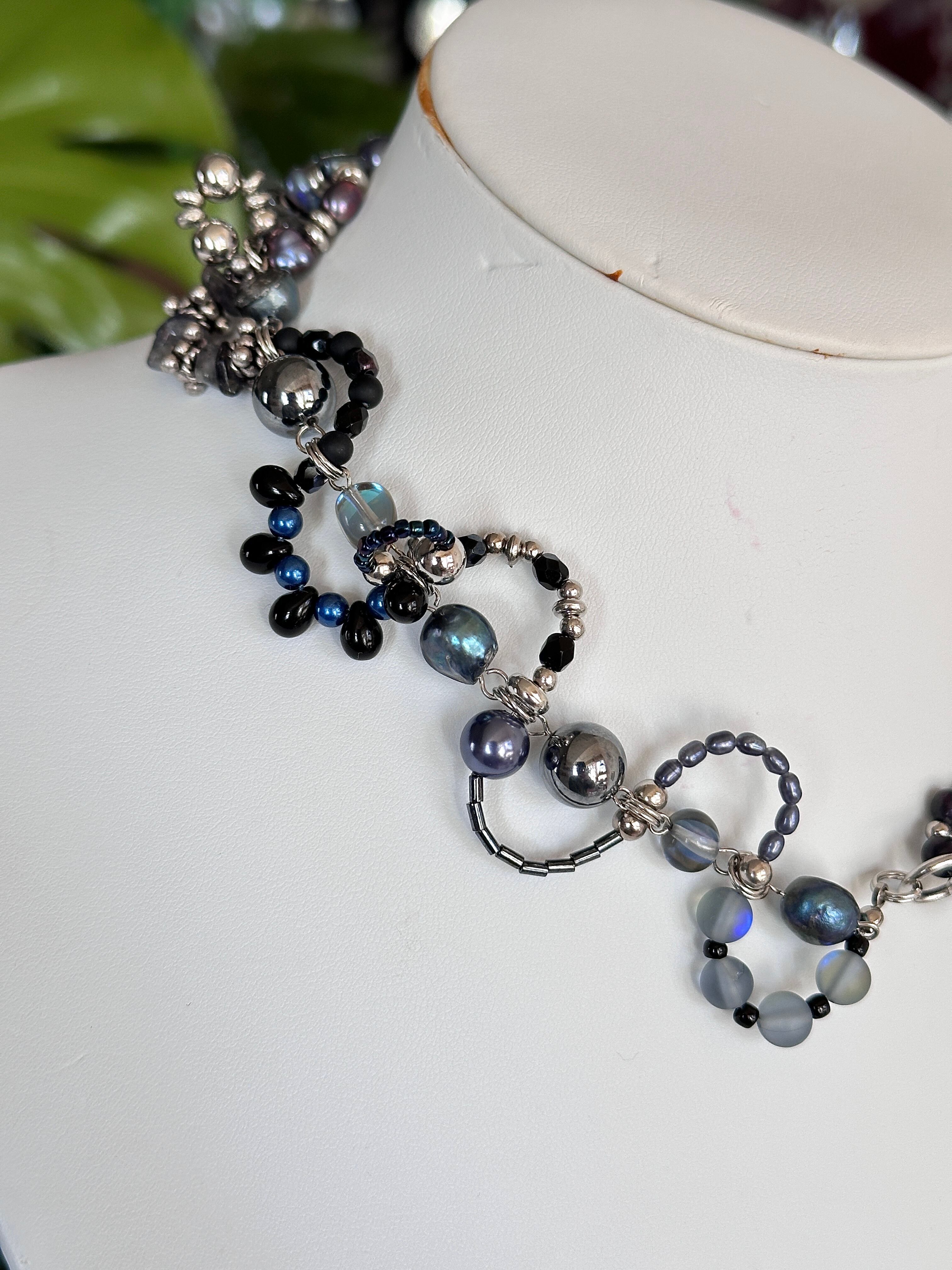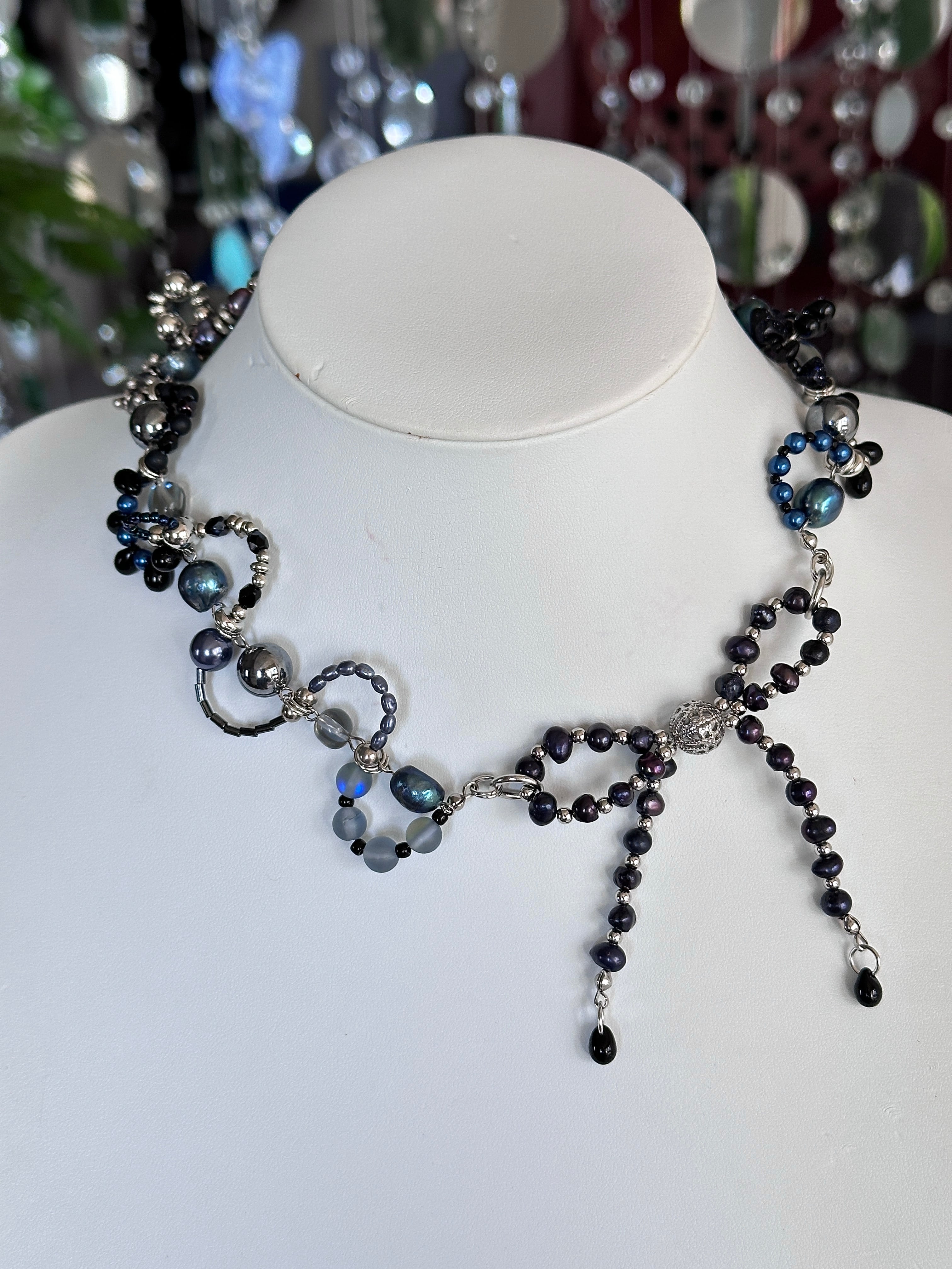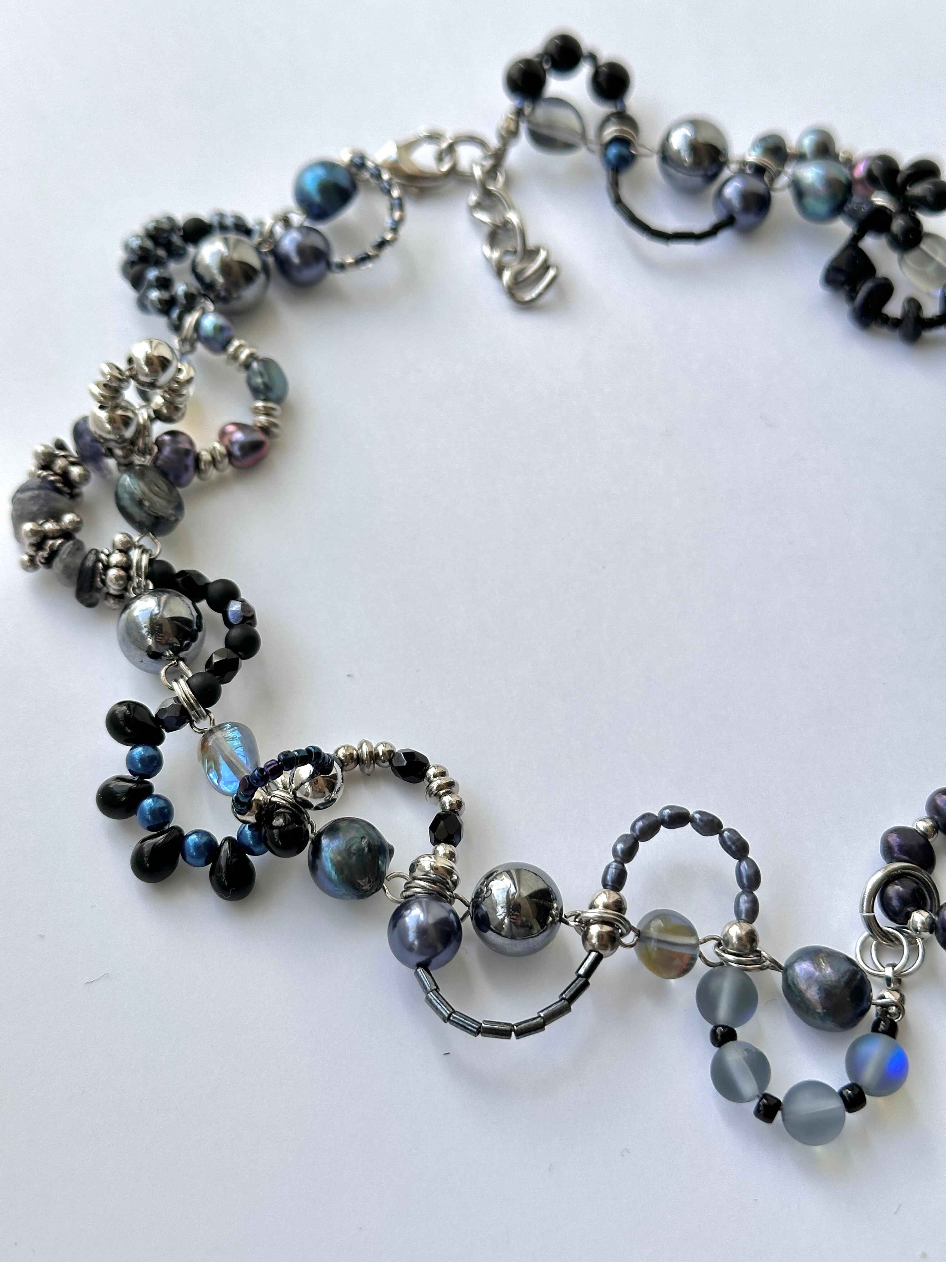 大小様々な淡水パールや天然石をフリルのようにあしらったネックレス。