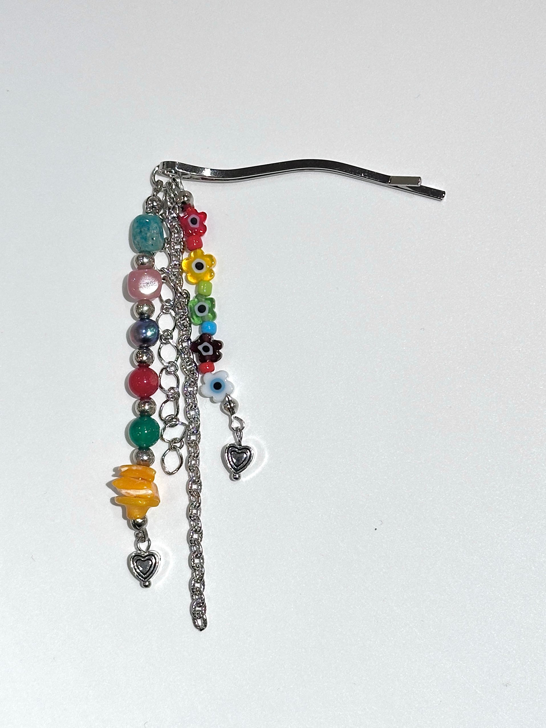 色とりどりの天然石とお花ビーズが目を惹くヘアピン。
