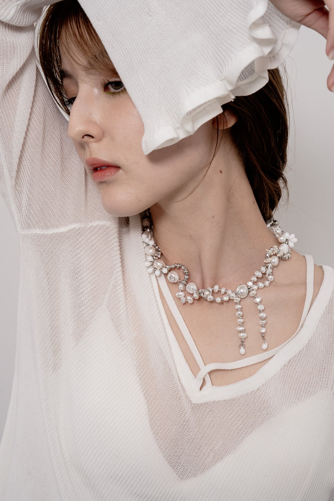大小様々なビーズをフリルのようにあしらったネックレス。