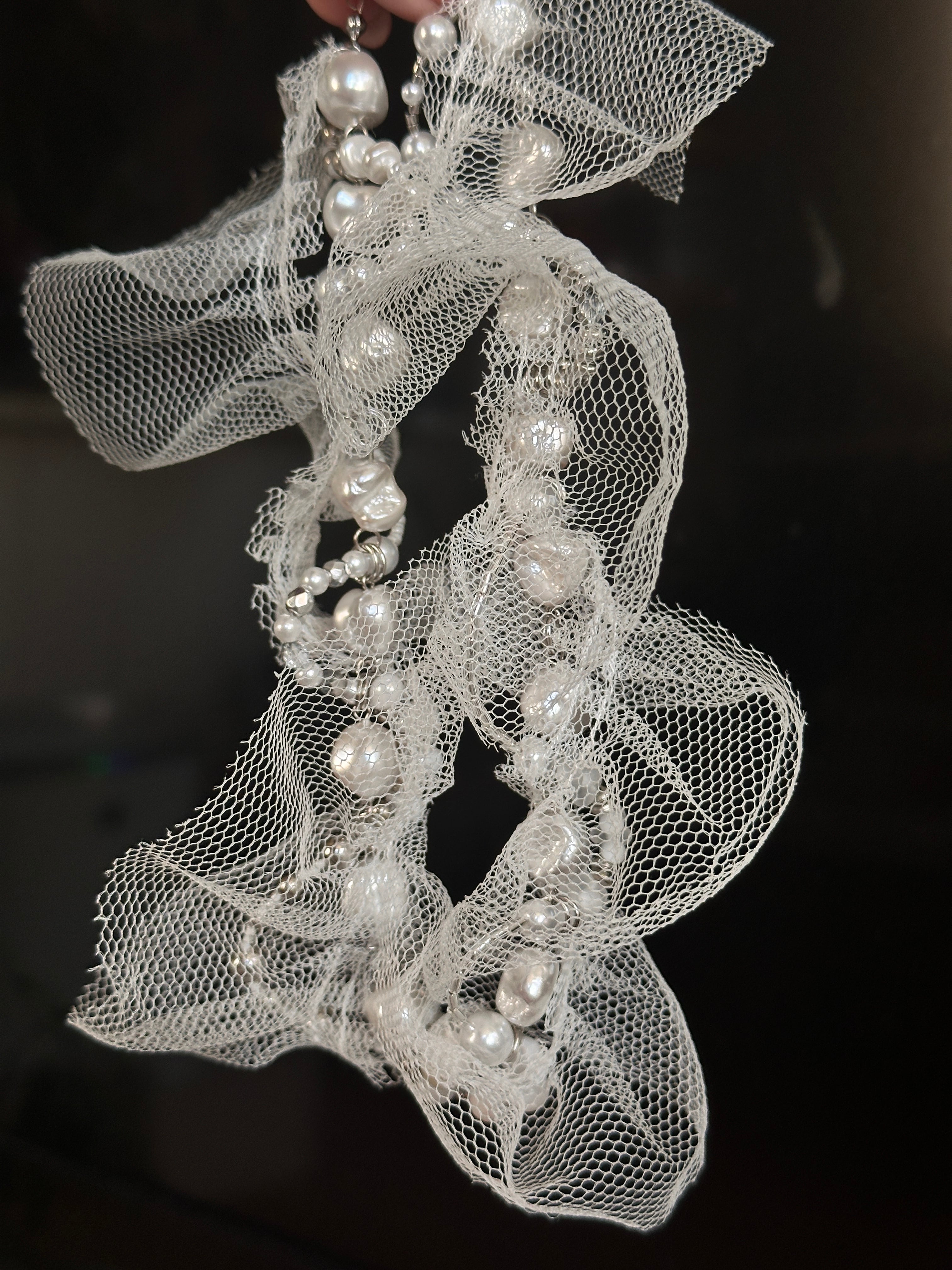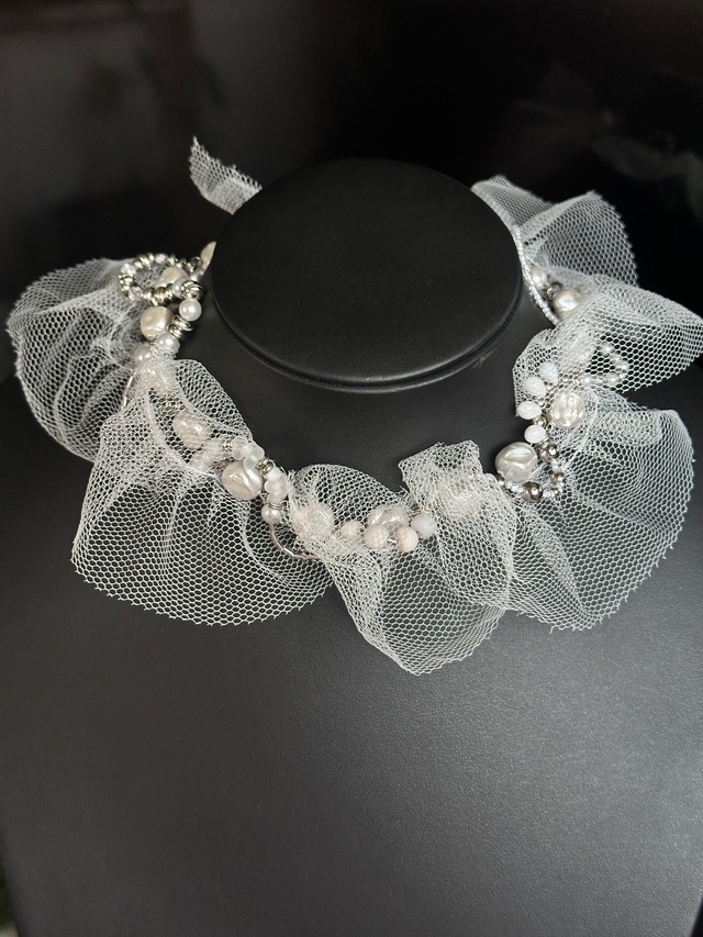 メッシュリボンと、艶をまとったパール・メタリックビーズを組み合わせた、モードで立体的なデザインネックレス。