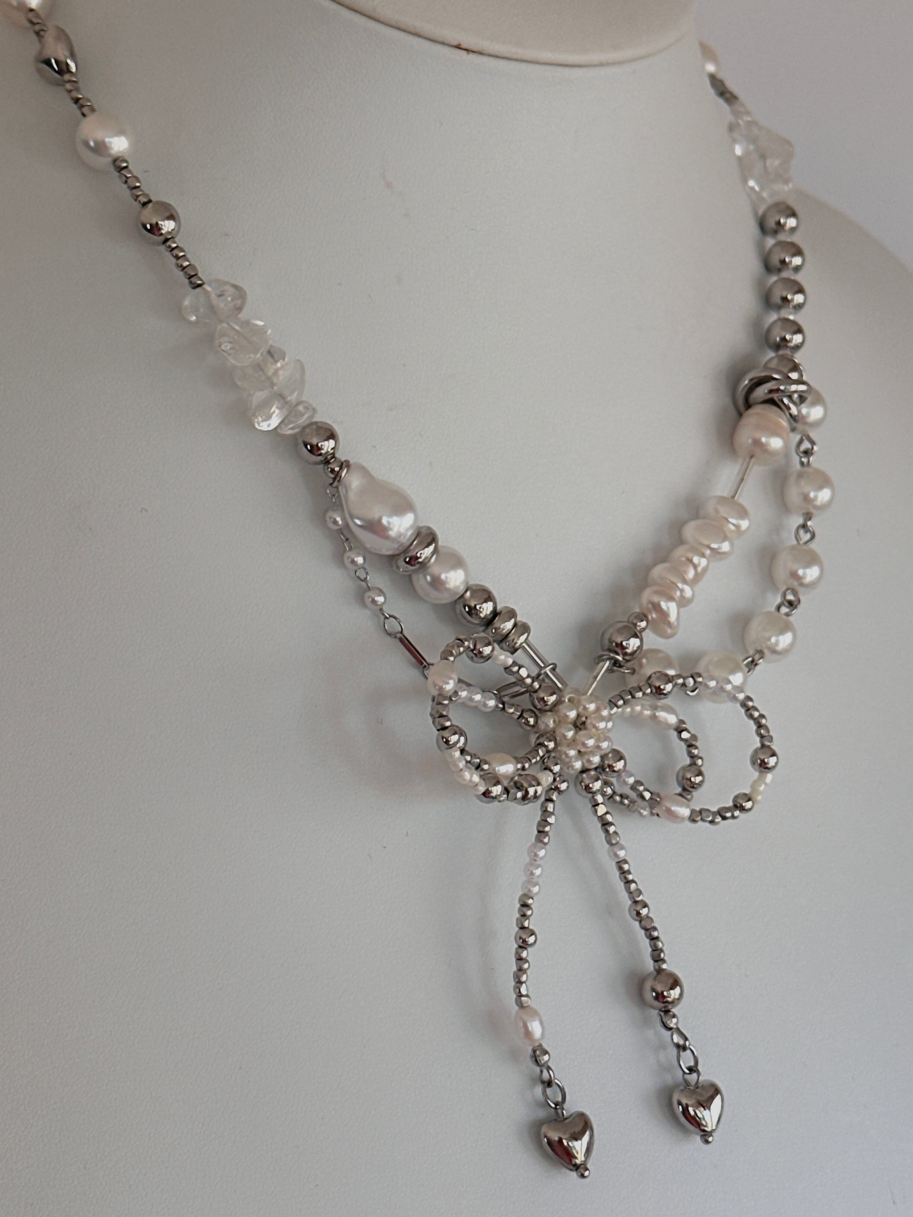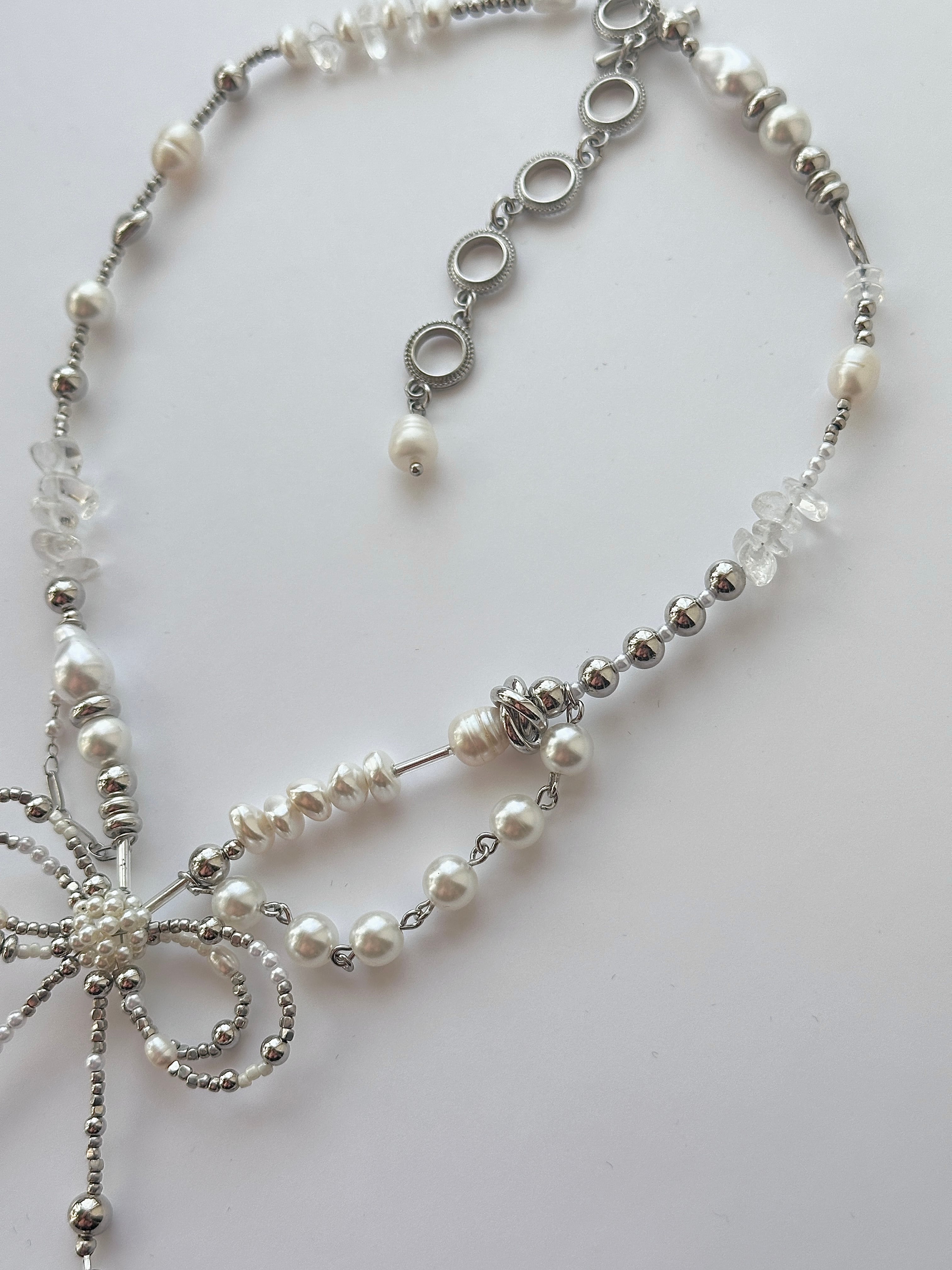 ビーズと天然石を織り交ぜて製作したリボンネックレス。
