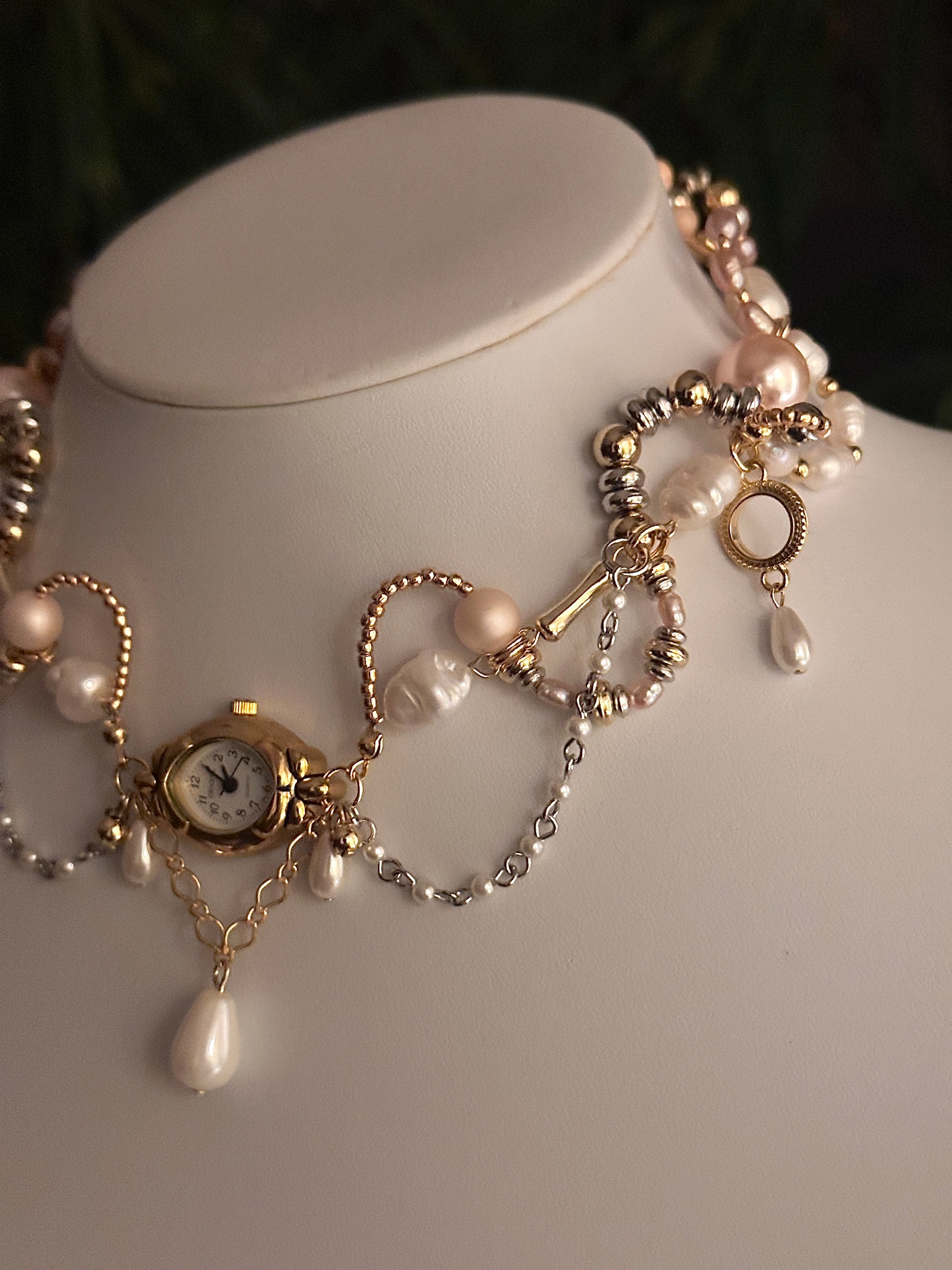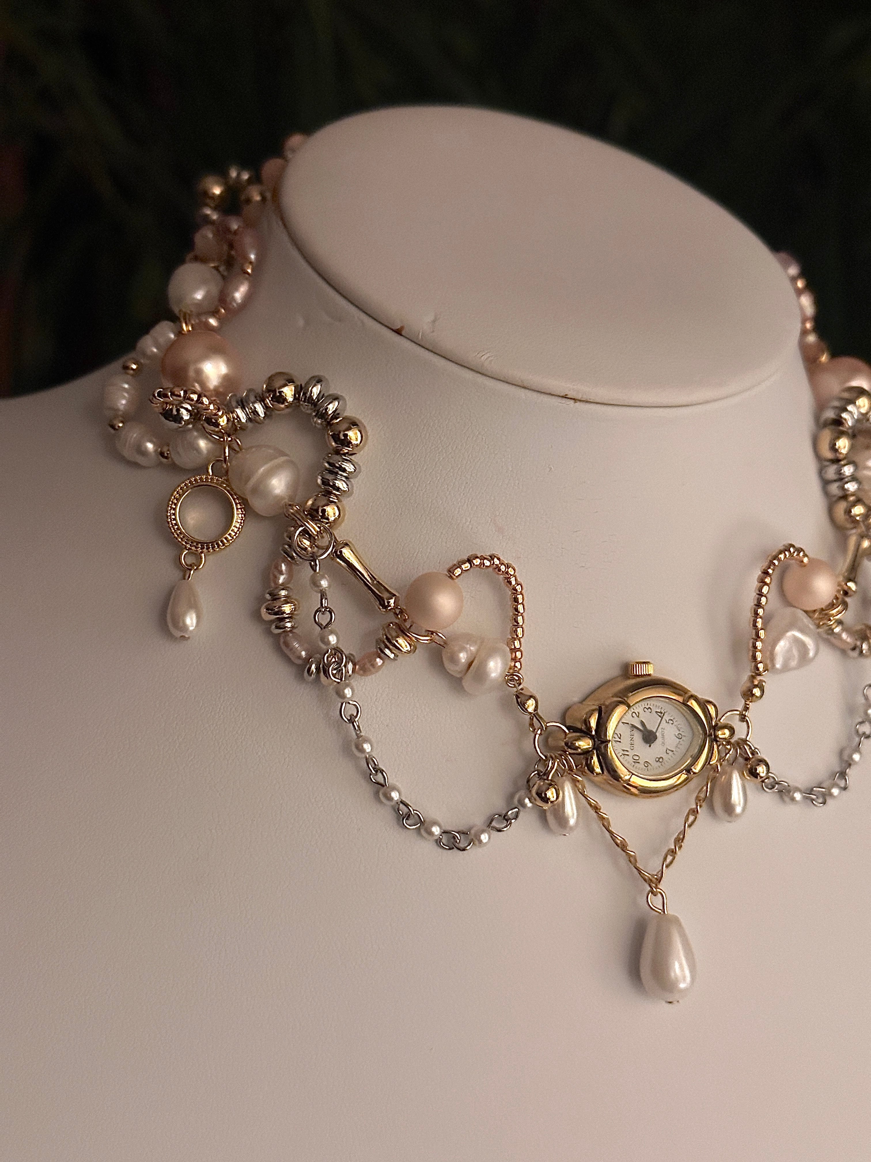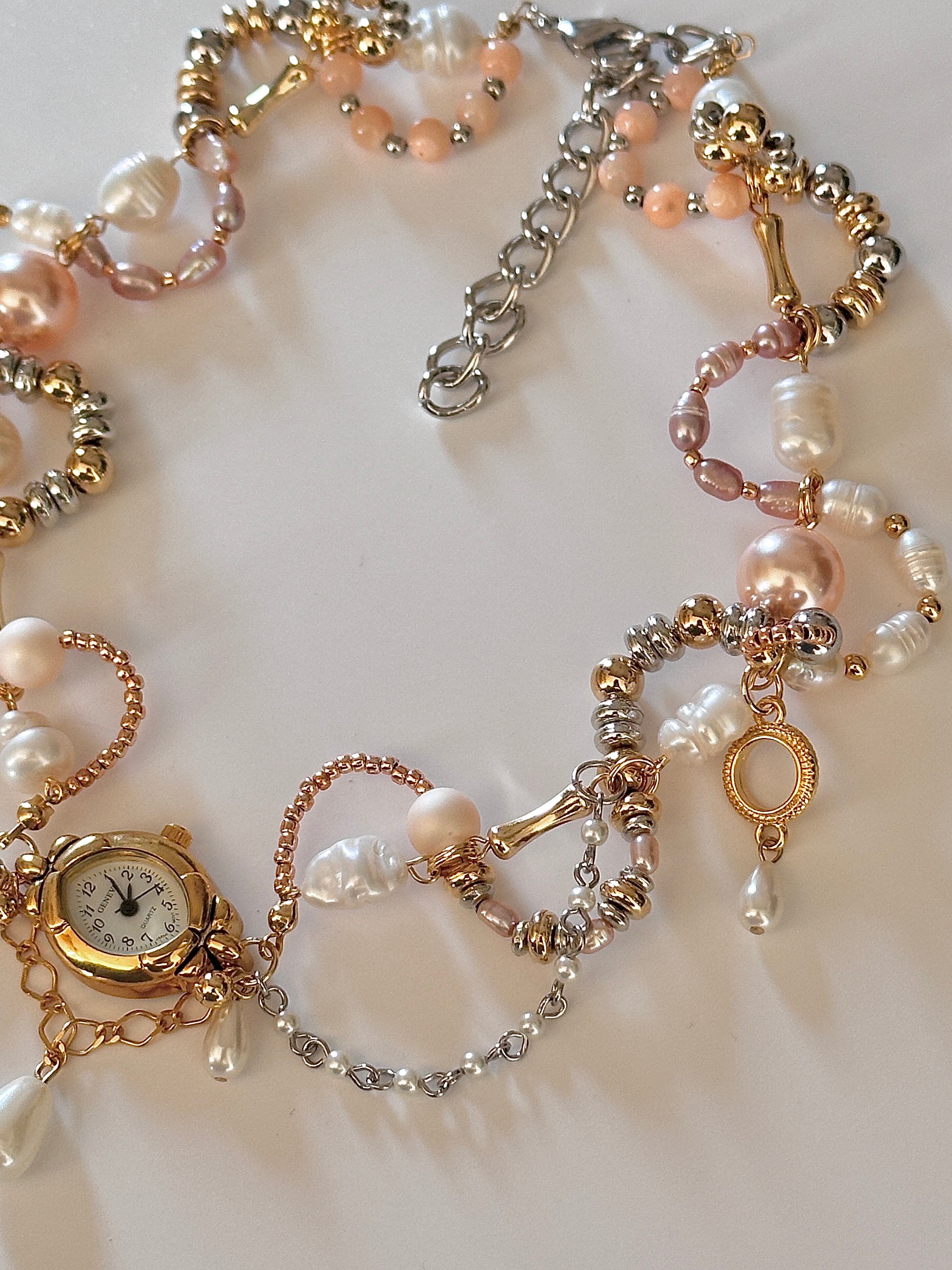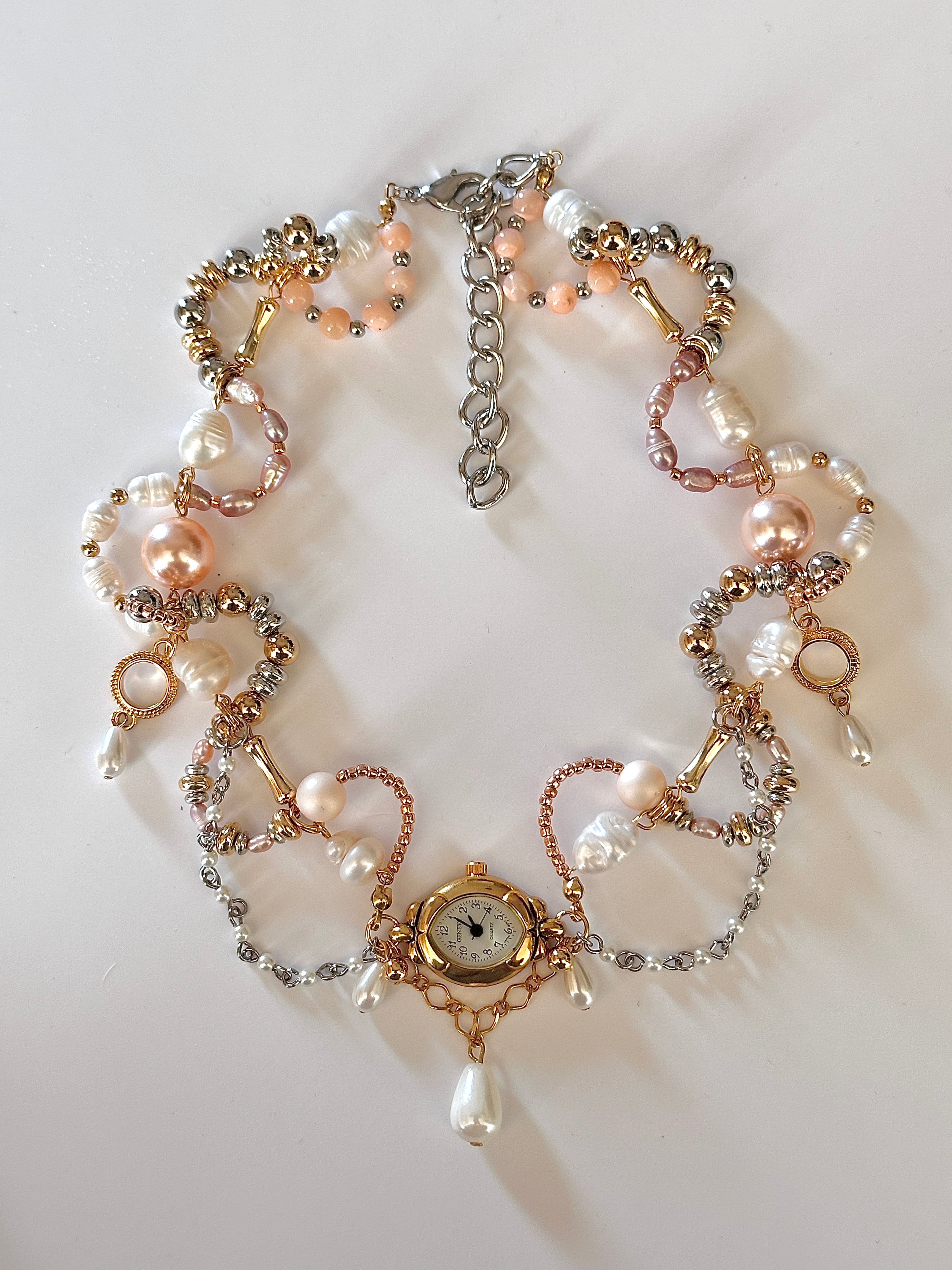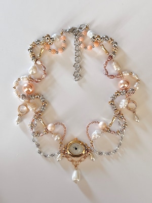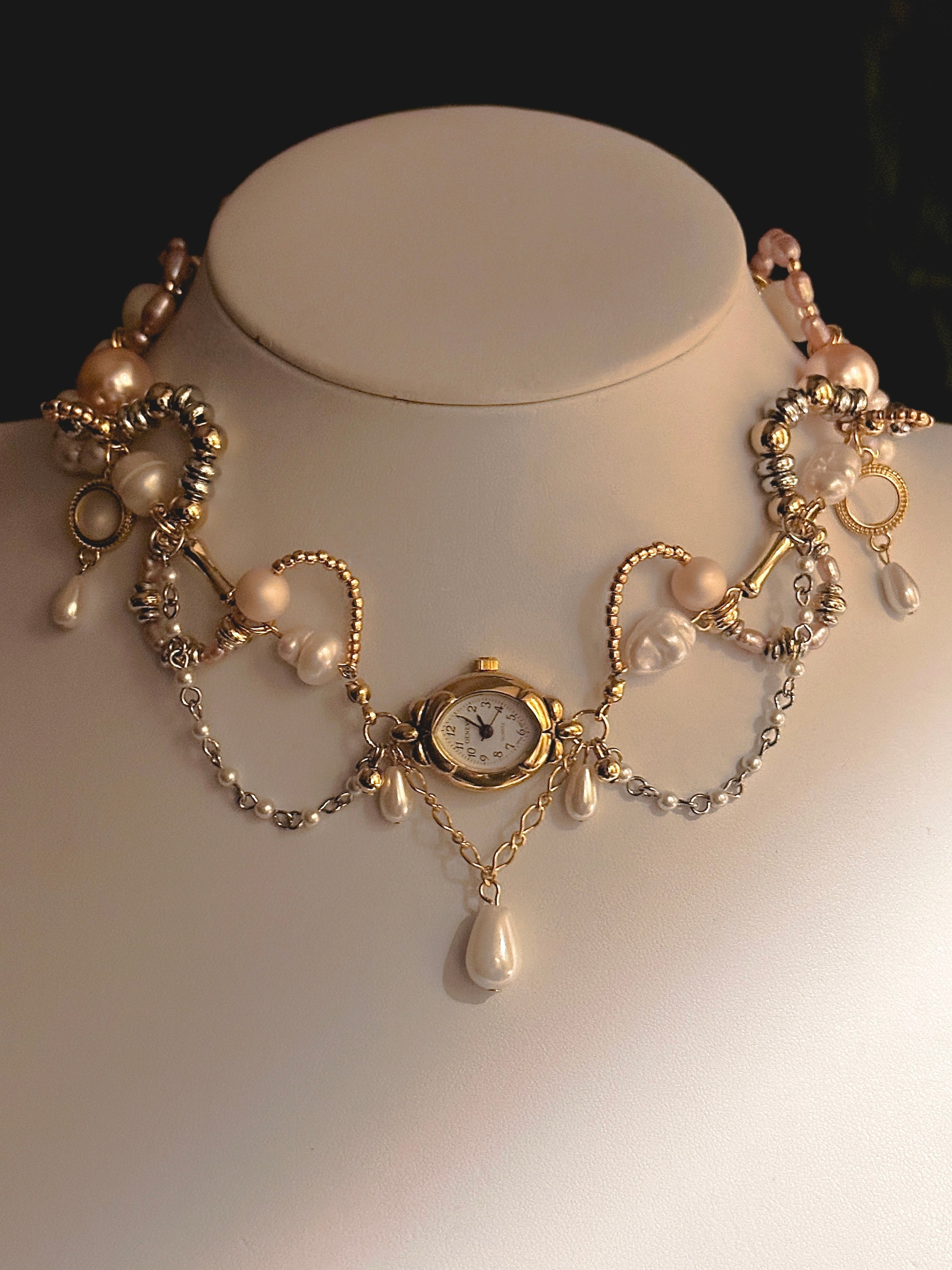 中央にはクラシカルなオーバル型のミニウォッチを配し、繊細なチェーンが幾重にも重なり、胸元に陰影とリズムを生むデザインに仕上げました。