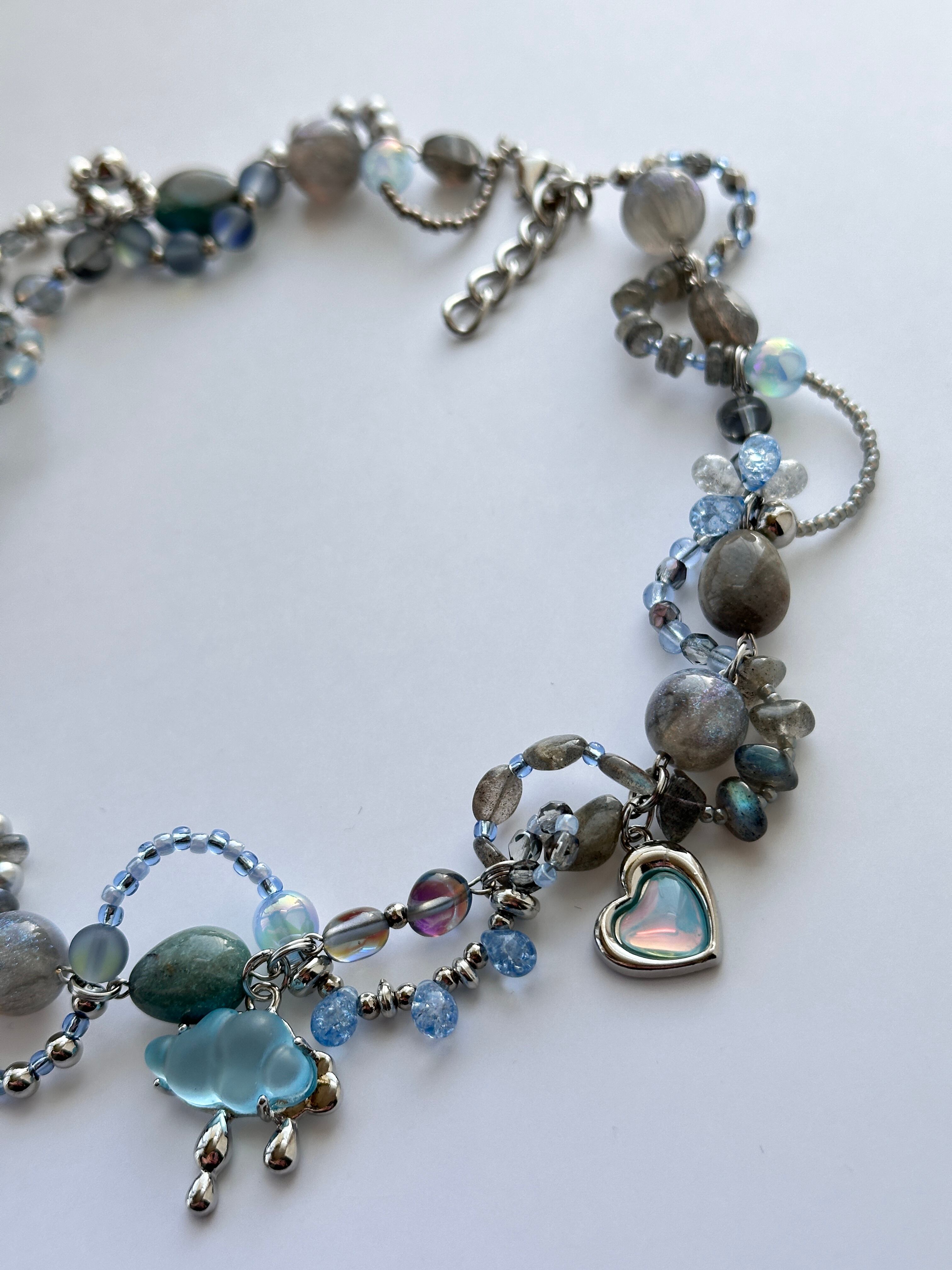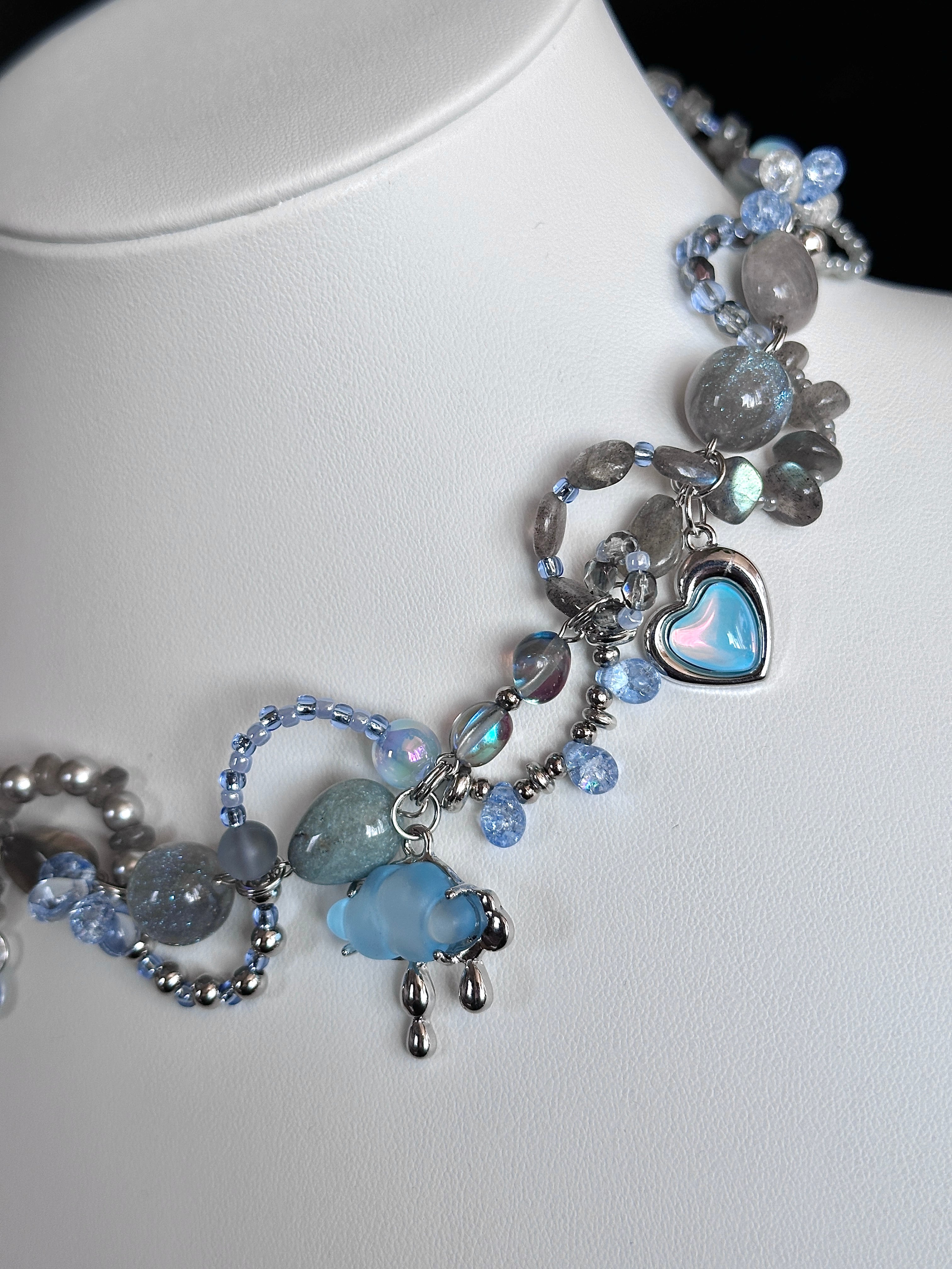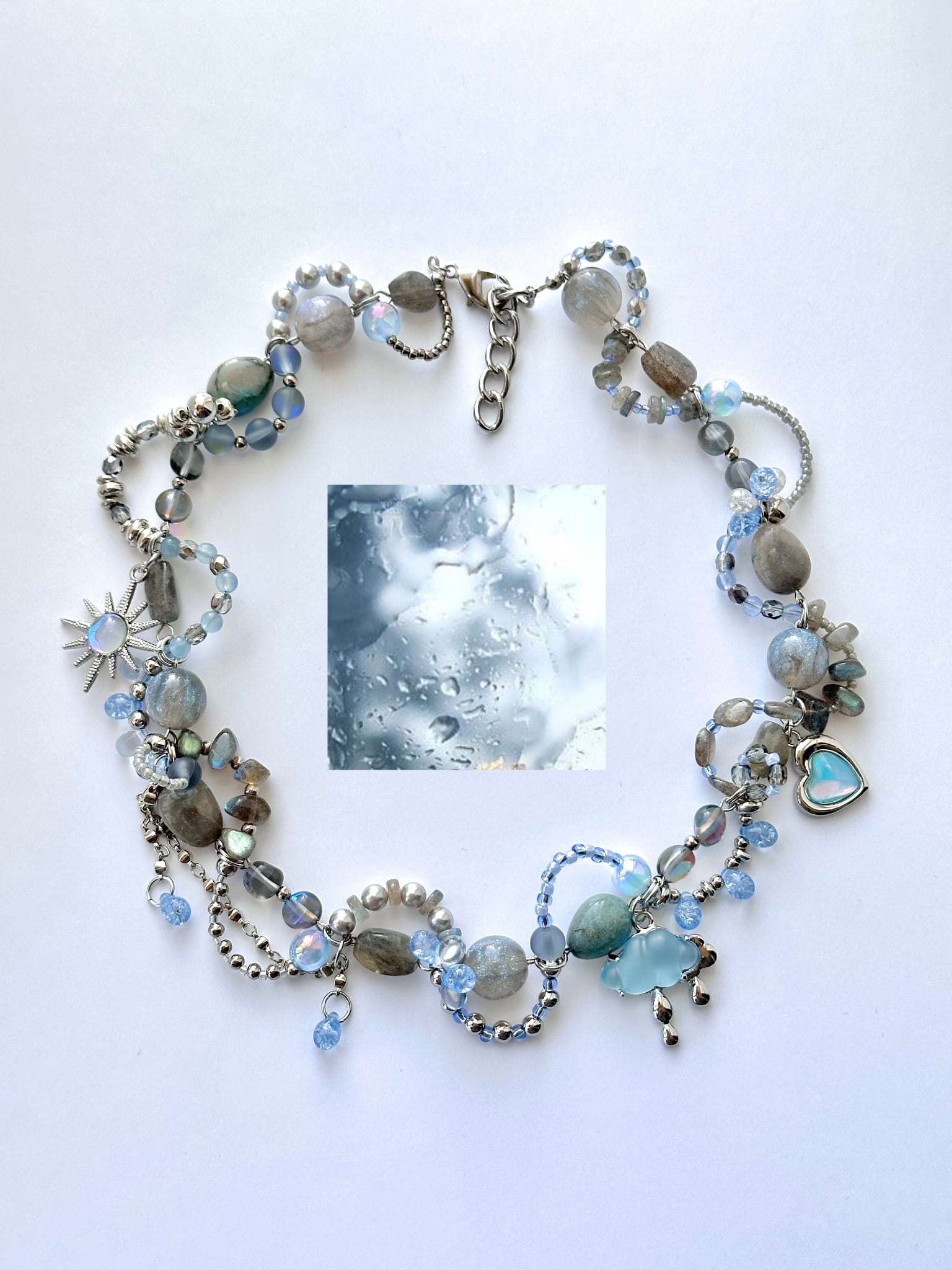 雨粒のように揺れるパーツや一点物の雲のチャームを添えました。