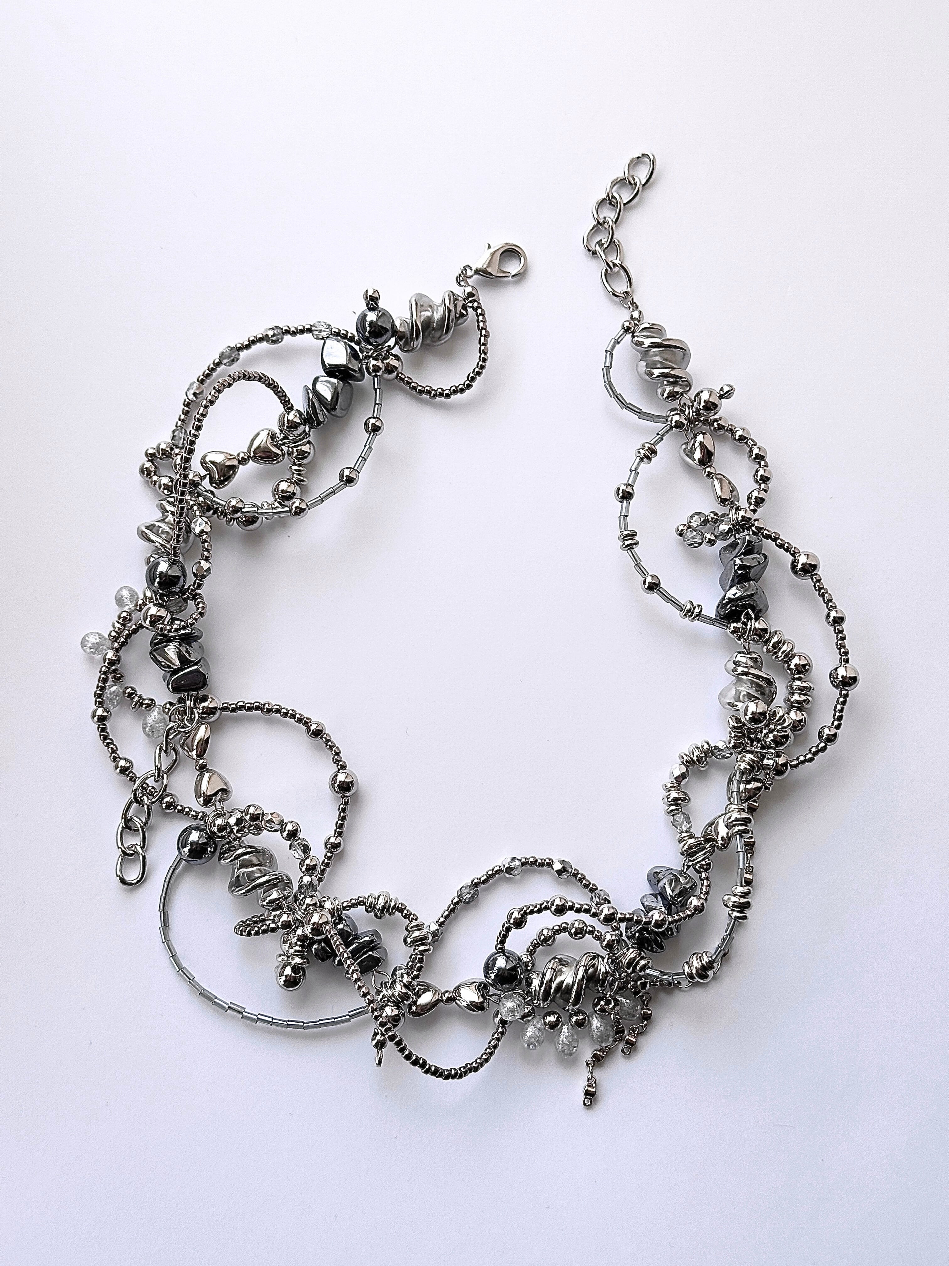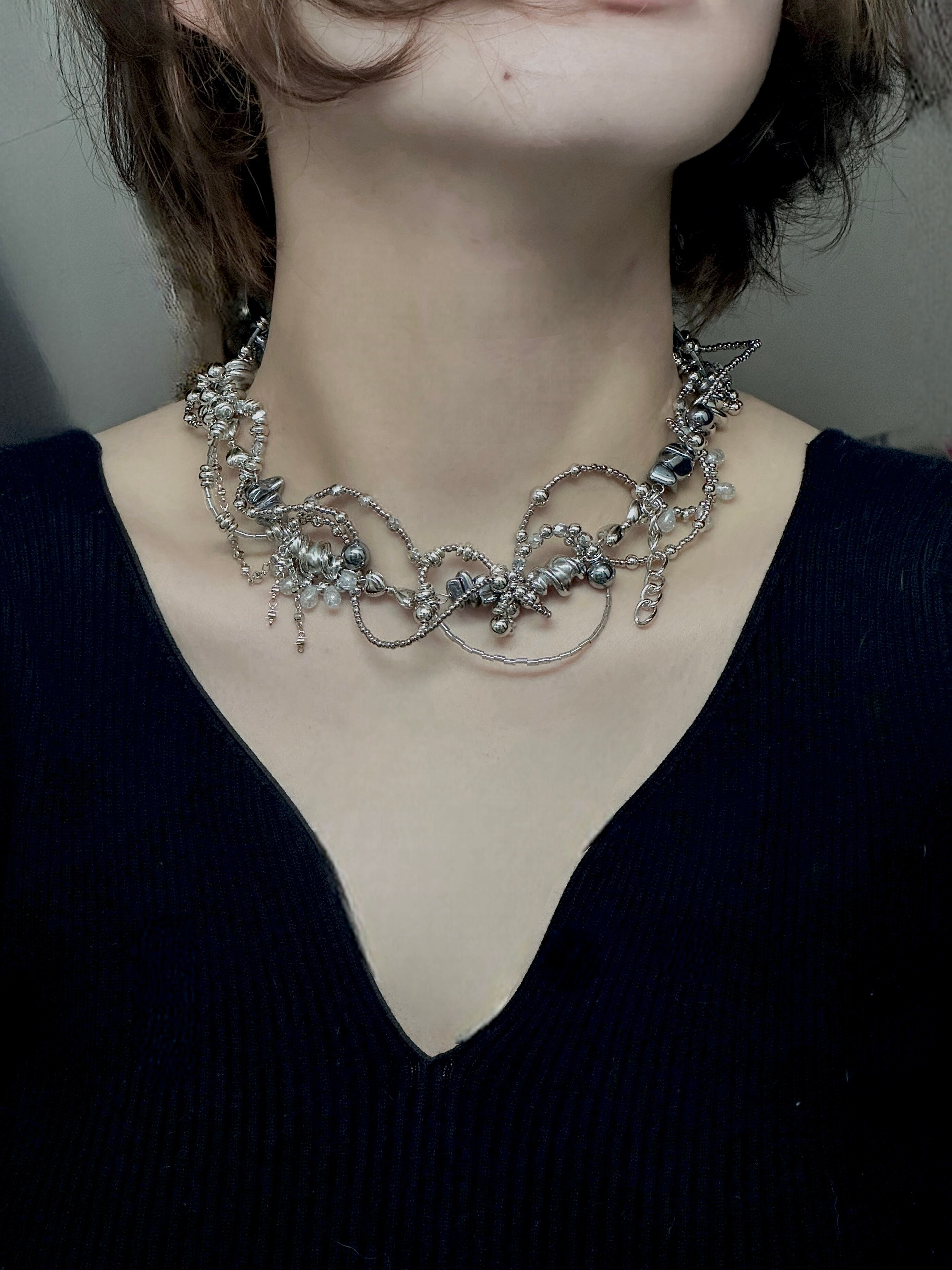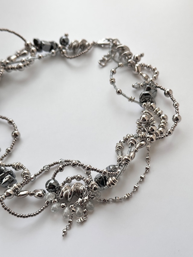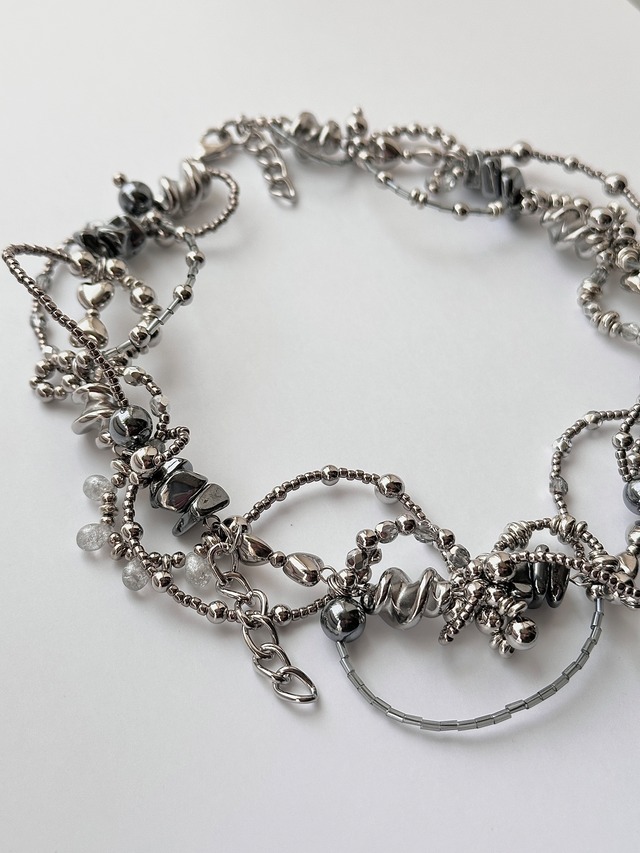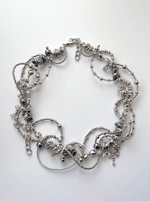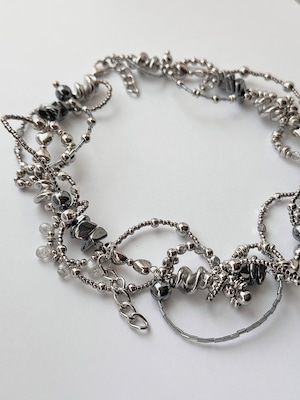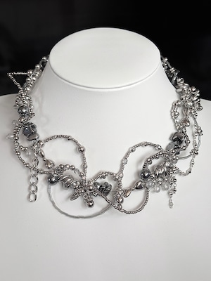 シルバーを基調に、メタリックな輝きと透明感のあるビーズを組み合わせ、ランダムでありながらも流れのあるフォルムに仕上げました。