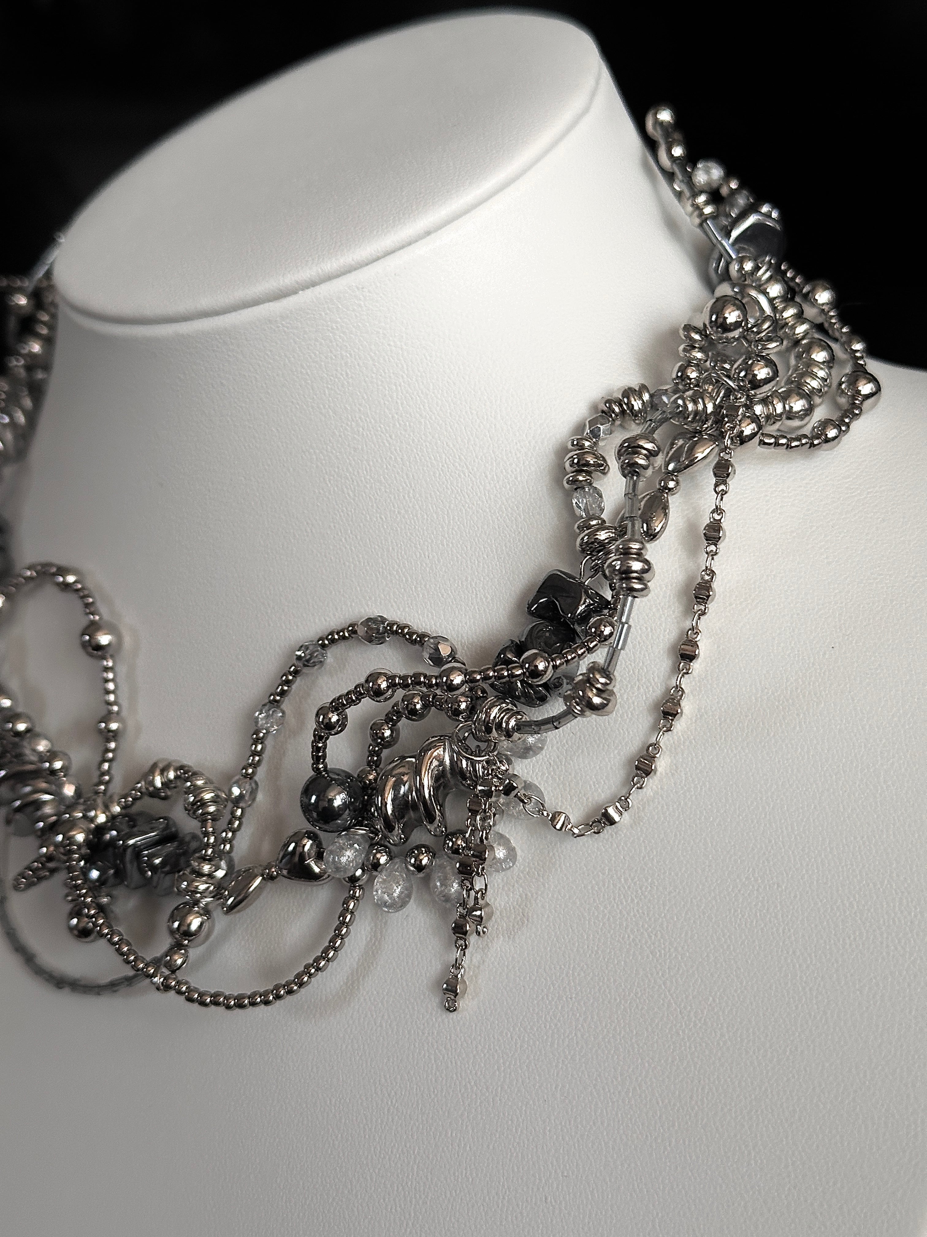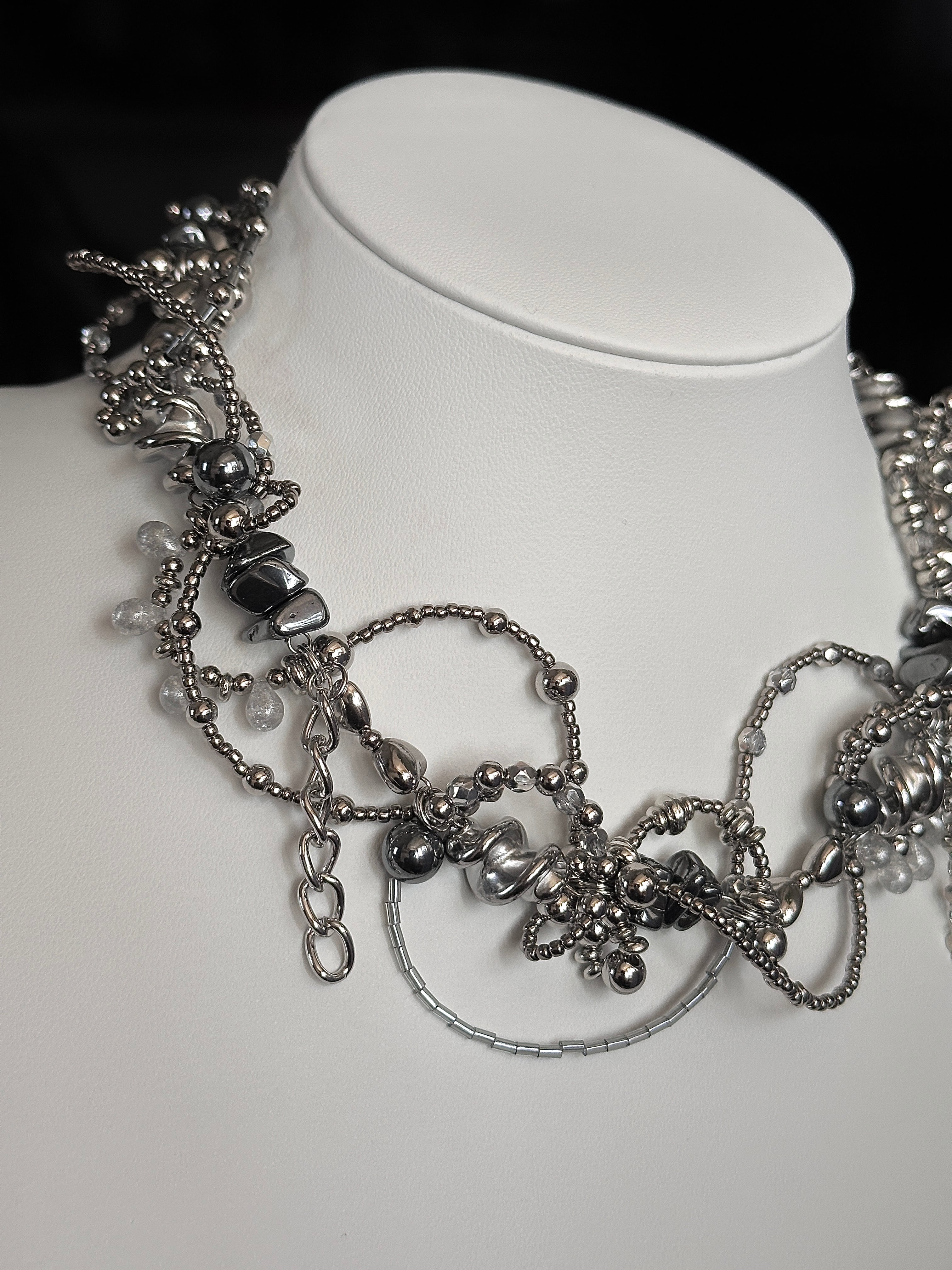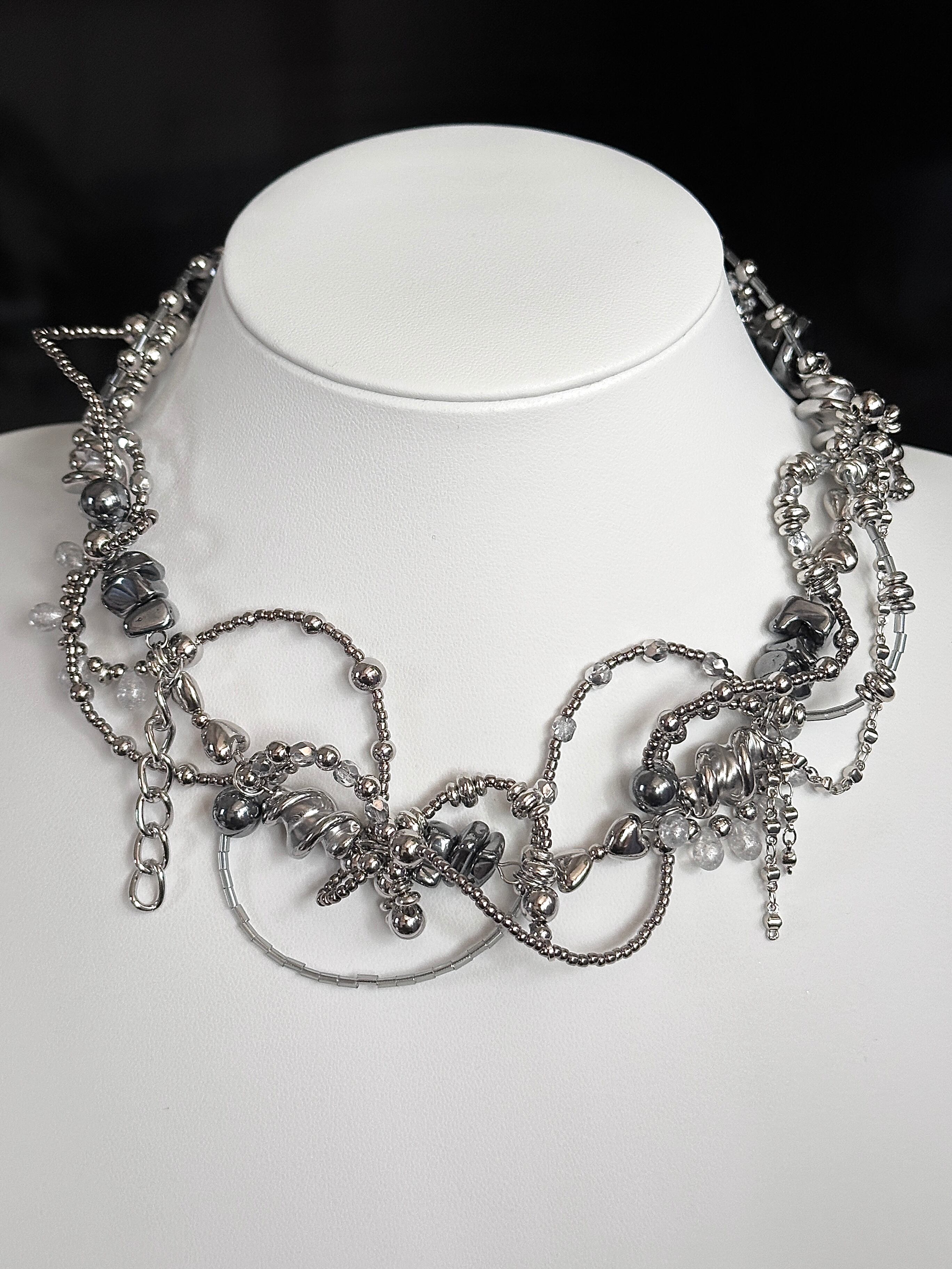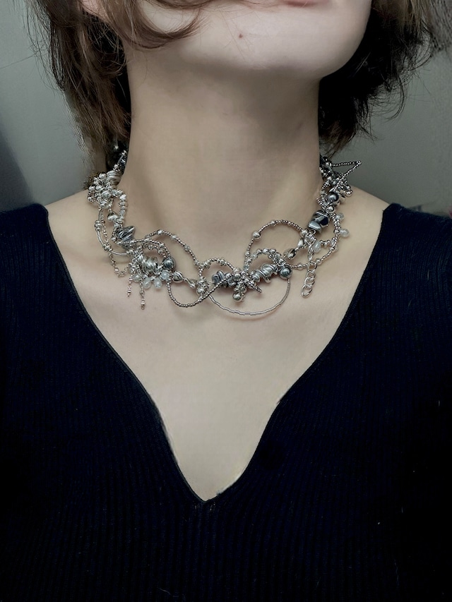 シルバーを基調に、メタリックな輝きと透明感のあるビーズを組み合わせ、ランダムでありながらも流れのあるフォルムに仕上げました。