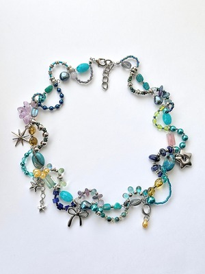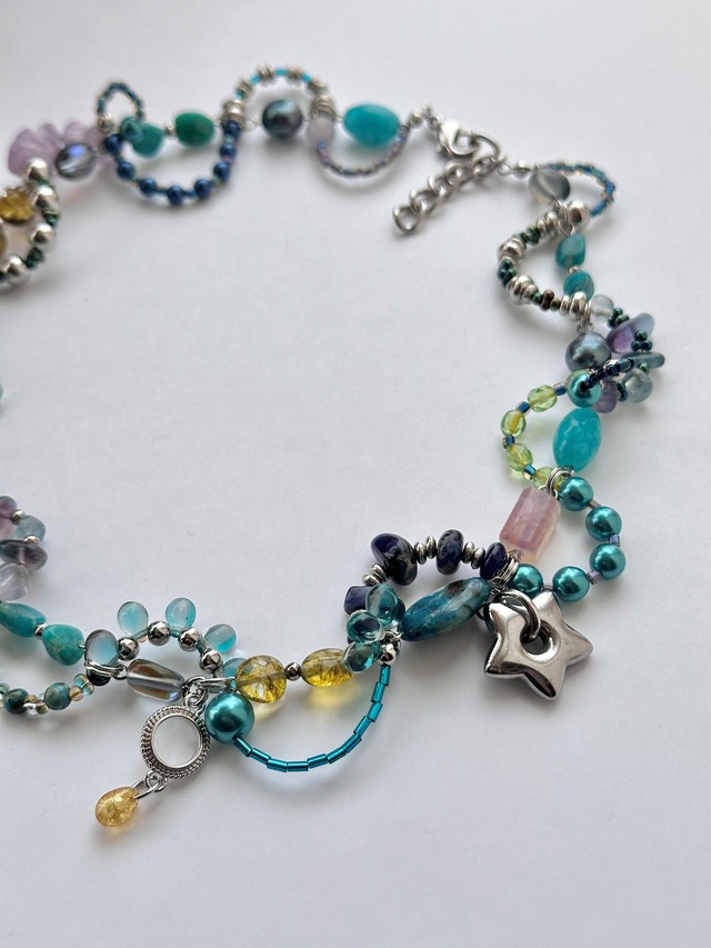 そのふたつを重ね合わせたような、ブルーとグリーンを基調にした一点もののネックレスです。